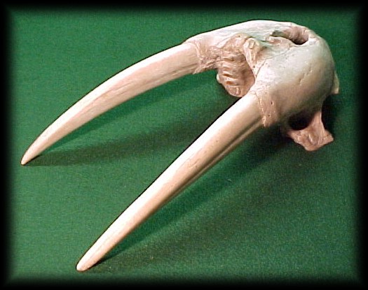 | Two skulls mounted for sale, on the left the walrus and on the right one of the sabre toothed cats Hoplophoneous. Ignore the disproportionate sizes and look at the shape of the tusks verses the sabres, if you don't see what I mean try another image of walrus tusks... | |
